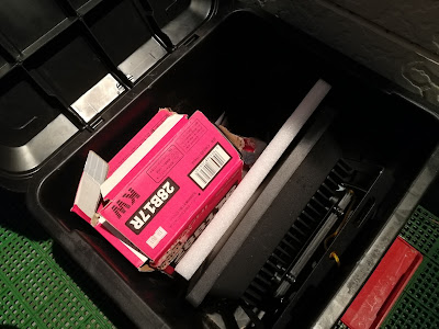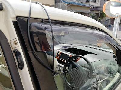 キャンプ場だと外に置いてるとパクられちゃうかもしれないので、モバイル電源は中に入れて窓少し空けてこんな感じにやってます。